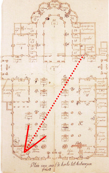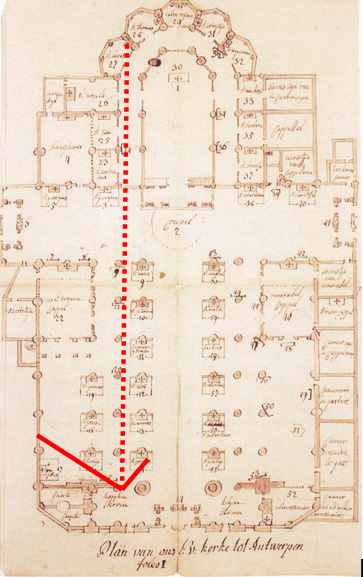 The northern side aisle of Antwerp cathedral, with the altarpieces of the fencers’ guild, Frans Floris’s Battle of the fallen angels, the tailors’ guild, an Adoration of the Magi by Artus Wolffort and more. Photos and markings of groundplan by Gary Schwartz.