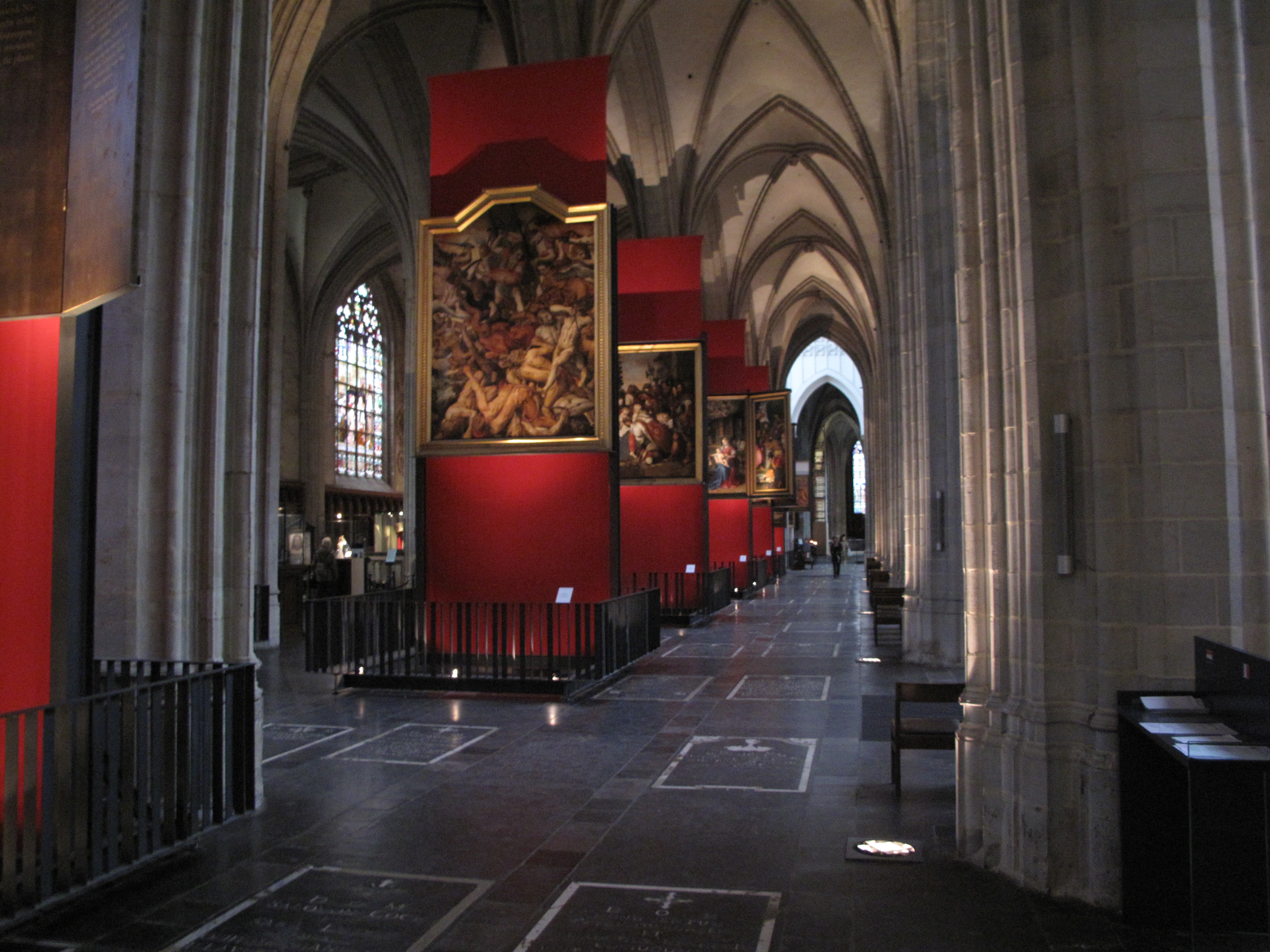 Transverse view from the first bay of the northern aisle, between Frans Floris’s Adoration of the shepherds for the gardeners’ guild and his Battle of the fallen angels, onto Wolffort’s Adoration of the Magi and, into the southern crossing, Rubens’s Descent from the Cross, always in the cathedral, but in the context of the exhibition seen in its historical function as the altarpiece for the musketeers’ guild.
